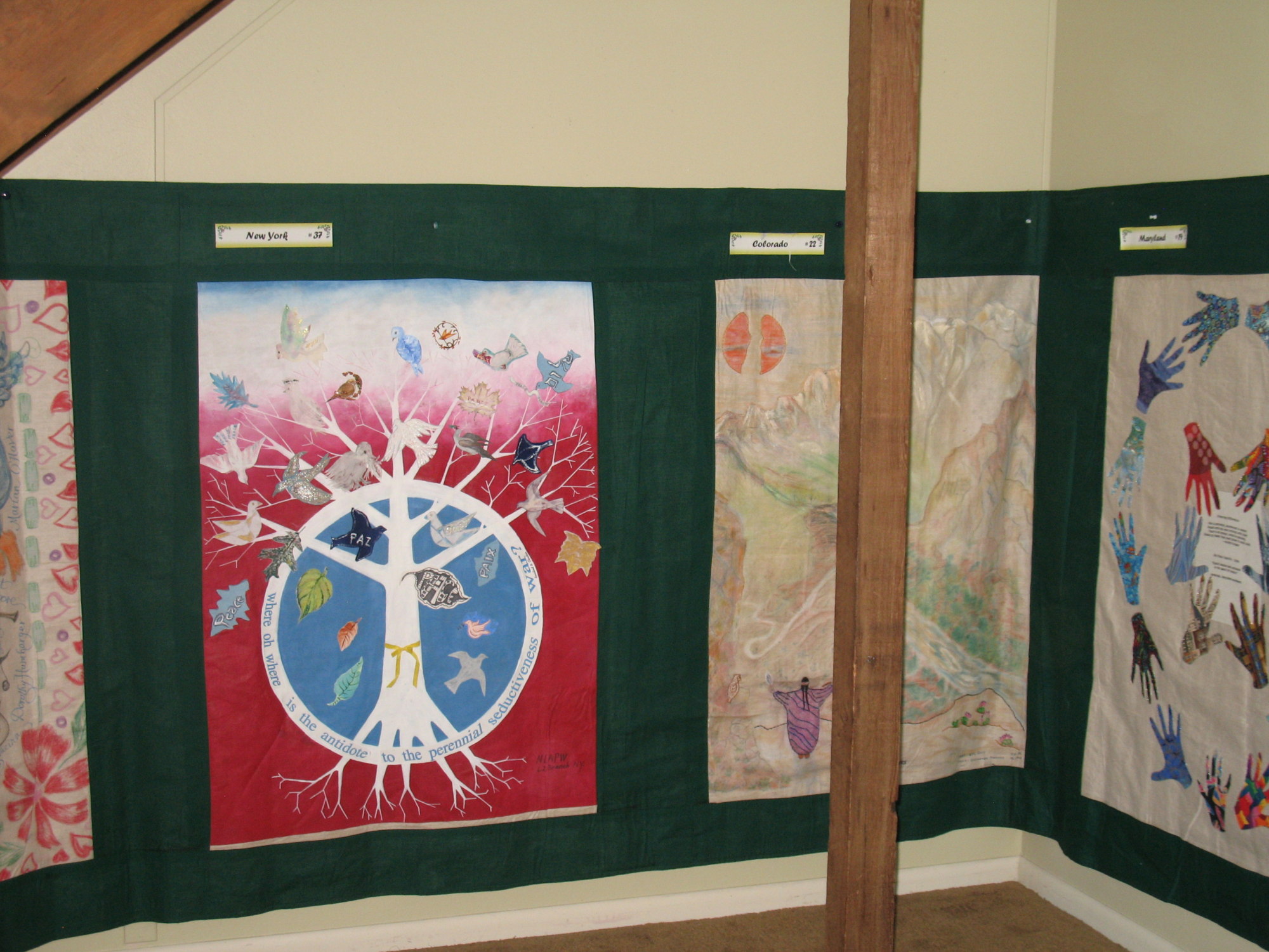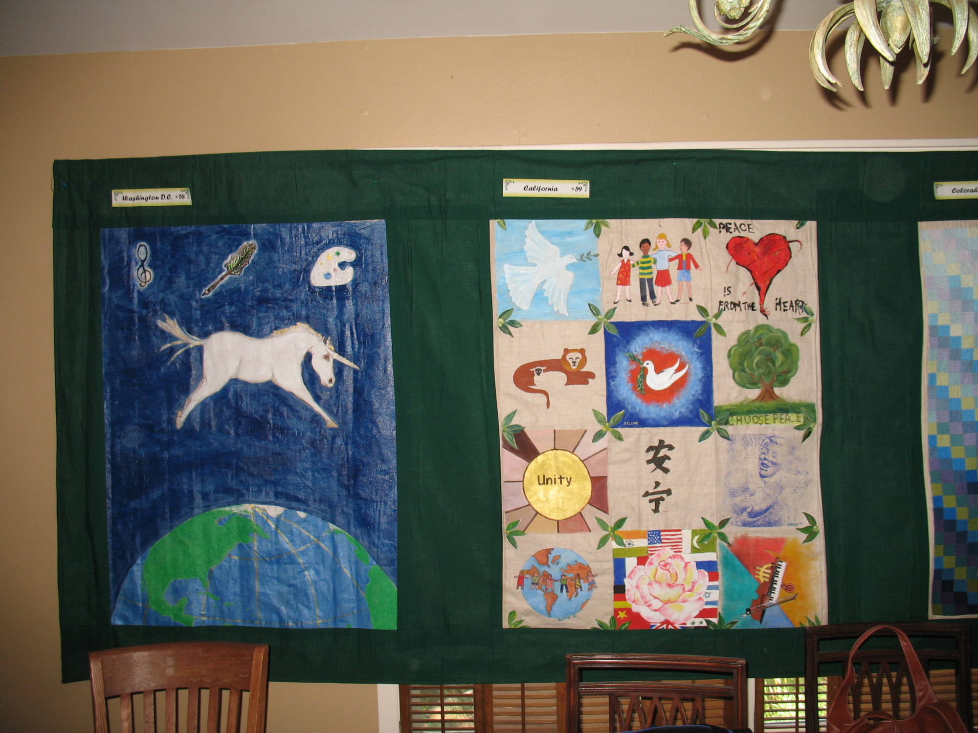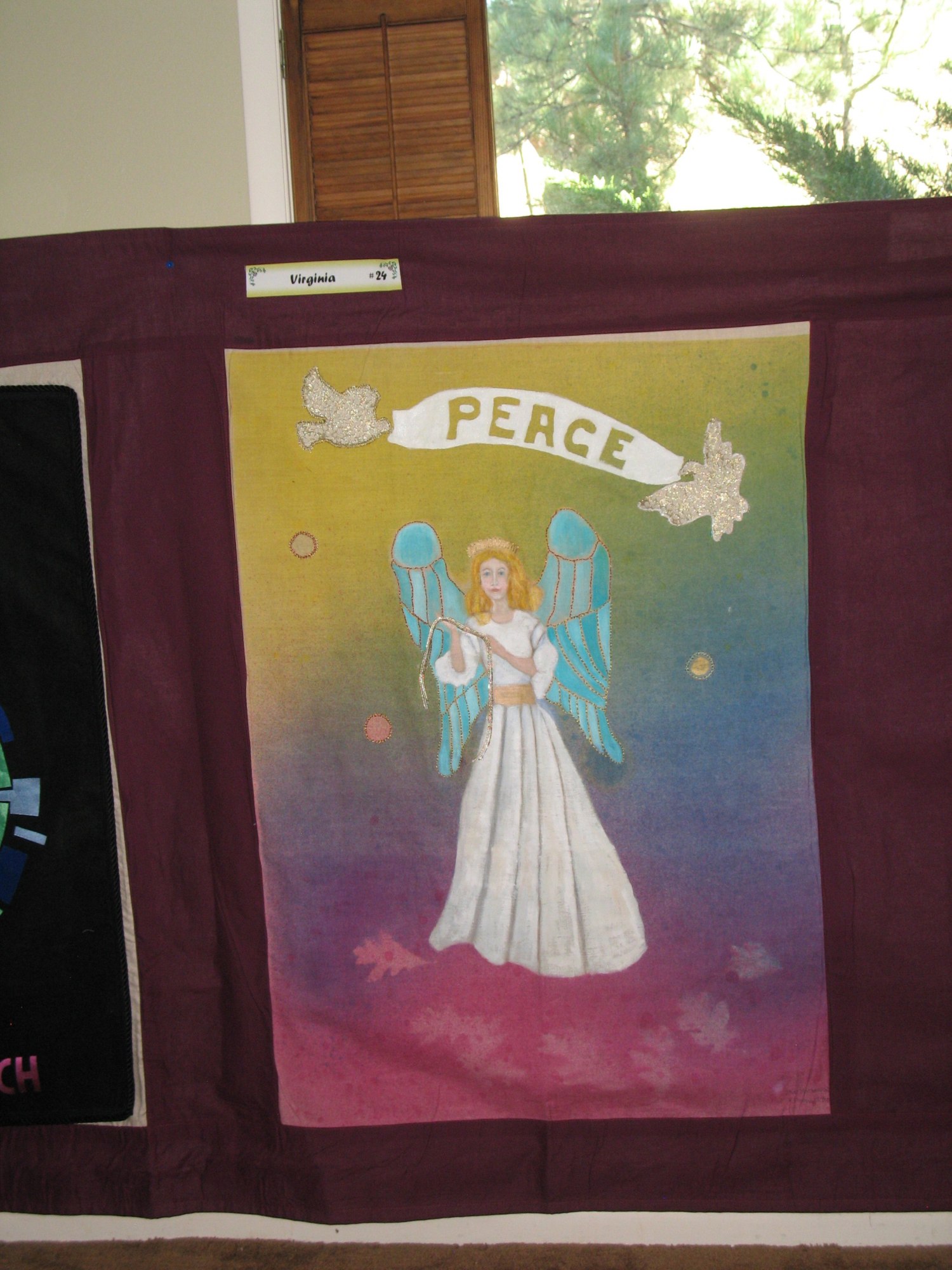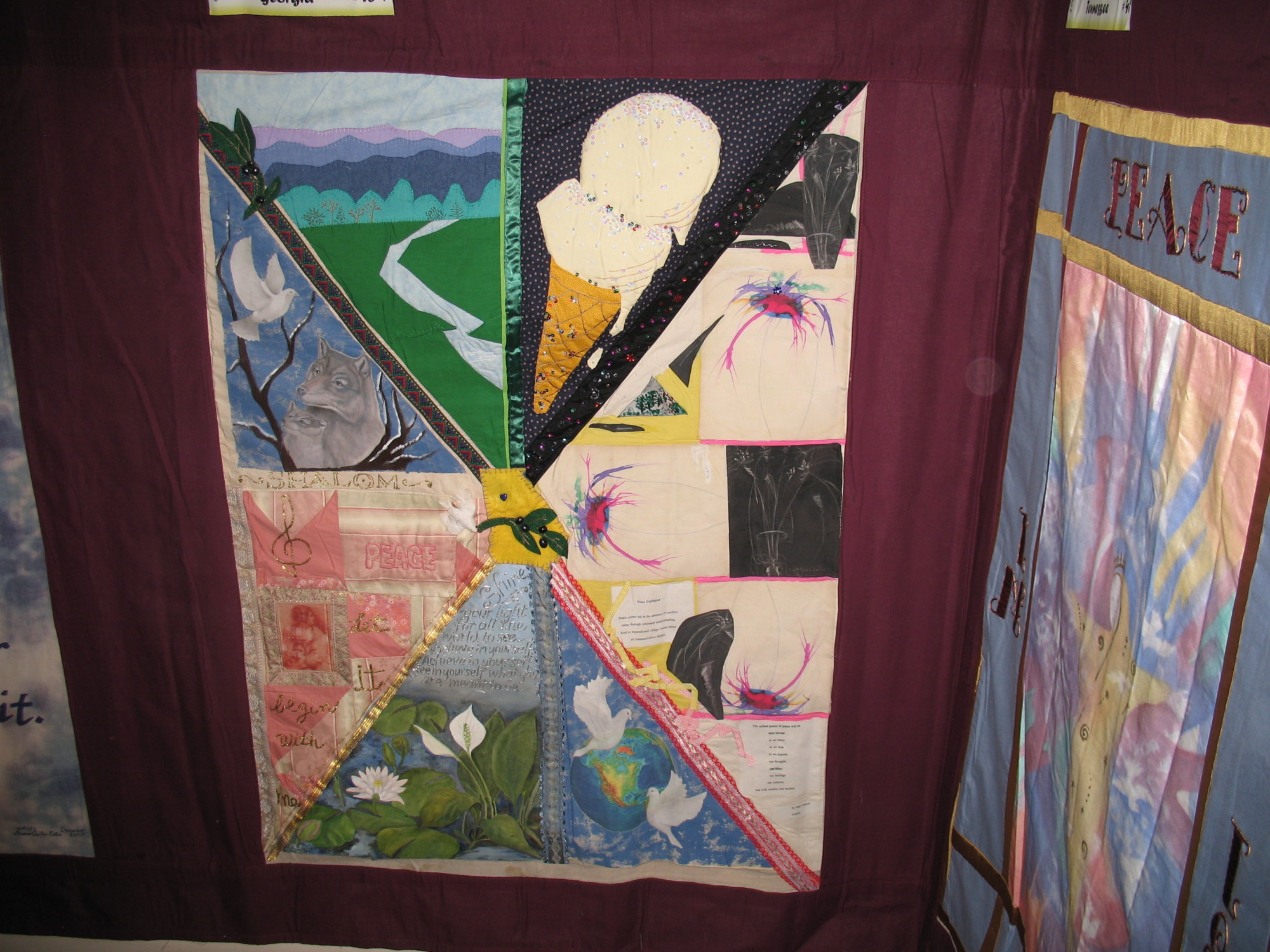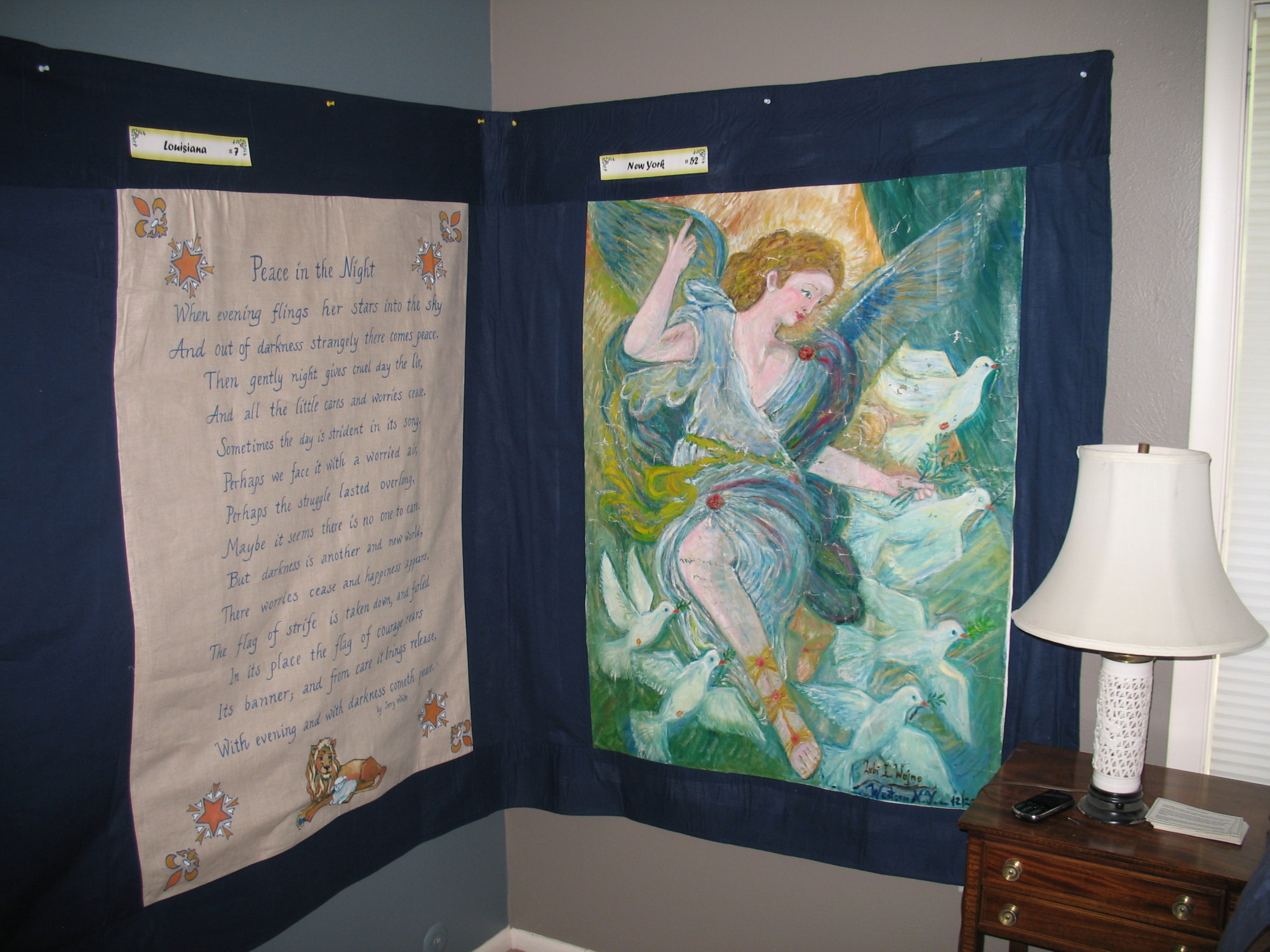 The Tapestry for Peace was inspired by a vision shown to the late Eve Mackintosh. One day on a highway she saw an angel holding two Earths: one up in the air and one close to her heart. A voice then said to Eve, “There is a place in space for peace.” This gave her the idea to create a tapestry depicting peace around the world. The quilt was created by Pen Women branches around the country, and other peace groups, schools, and individuals around the world. Eve saw the first panels finished before she died in 2005. Since then the entire quilt has been completed. A documentary DVD has been made, and the tapestry was temporarily put on display.