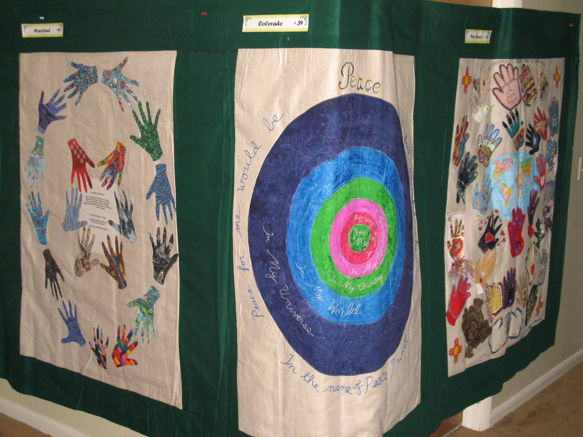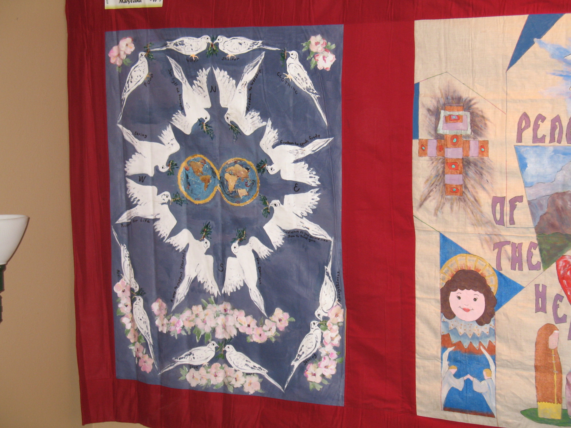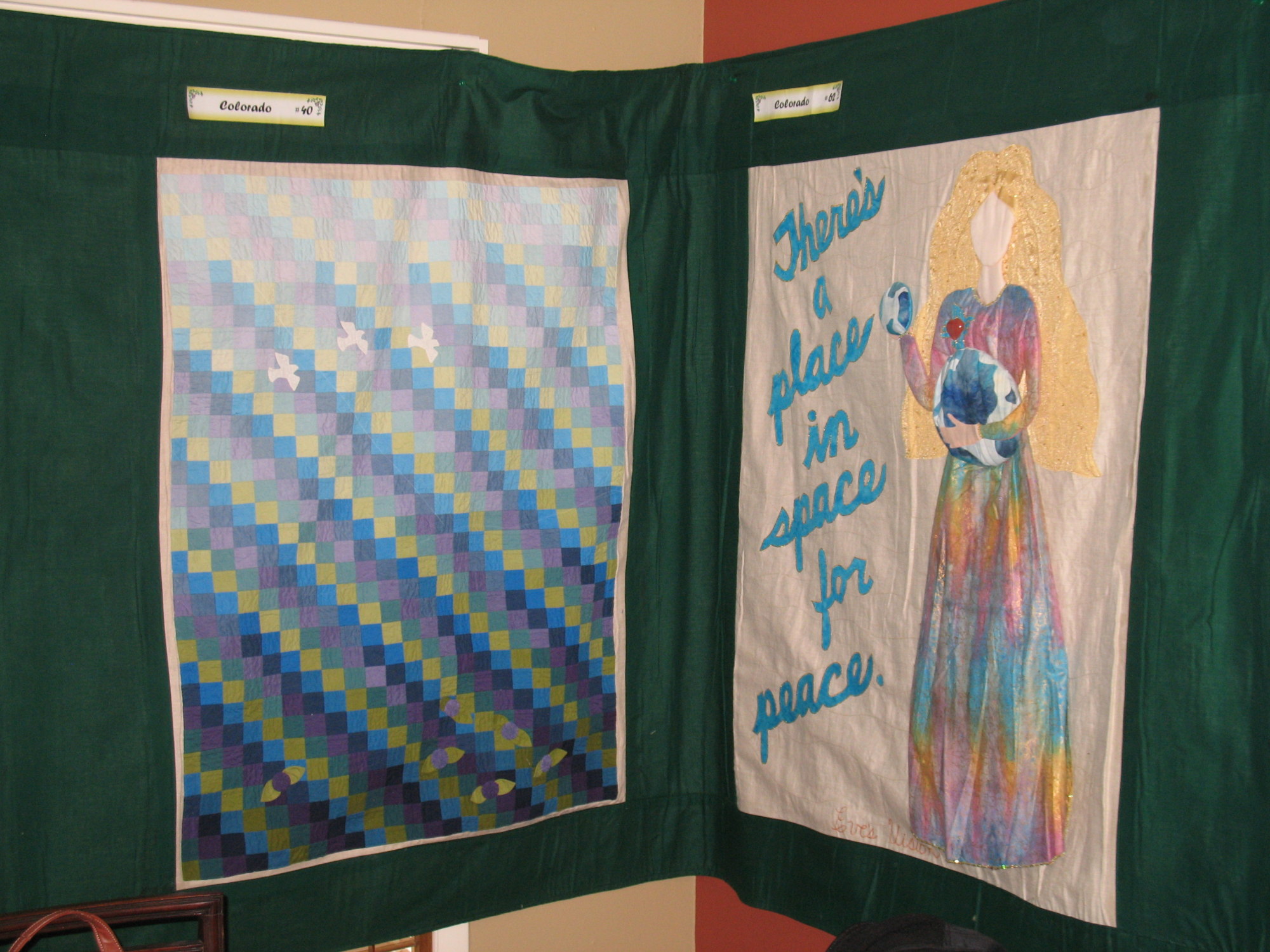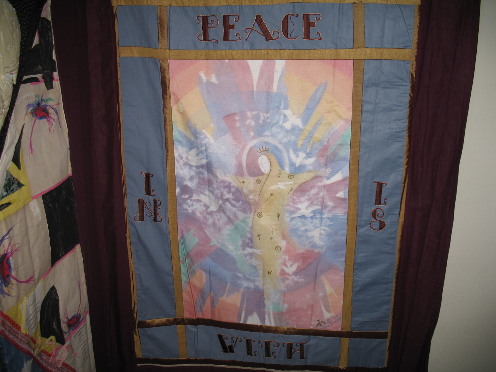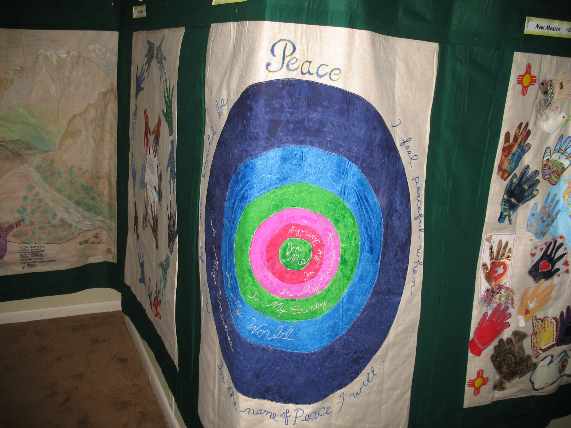 The Tapestry for Peace was inspired by a vision shown to the late Eve Mackintosh. One day on a highway she saw an angel holding two Earths: one up in the air and one close to her heart. A voice then said to Eve, “There is a place in space for peace.” This gave her the idea to create a tapestry depicting peace around the world. The quilt was created by Pen Women branches around the country, and other peace groups, schools, and individuals around the world. Eve saw the first panels finished before she died in 2005. Since then the entire quilt has been completed. A documentary DVD has been made, and the tapestry was temporarily put on display.