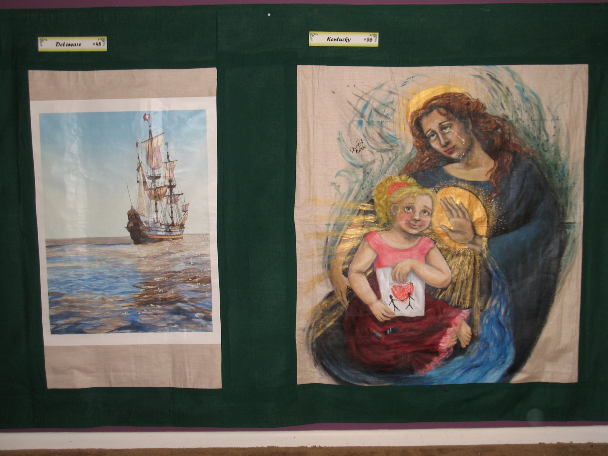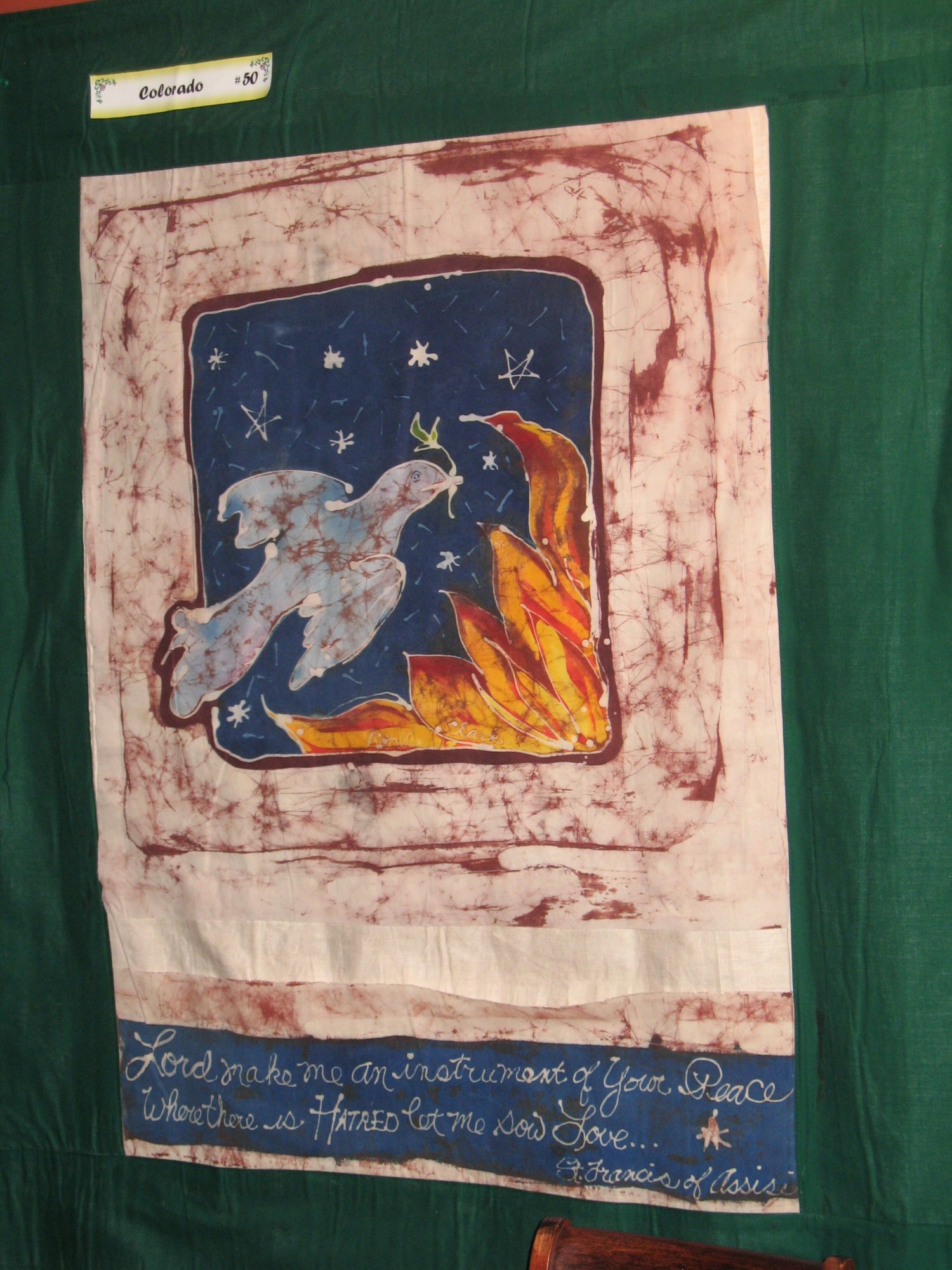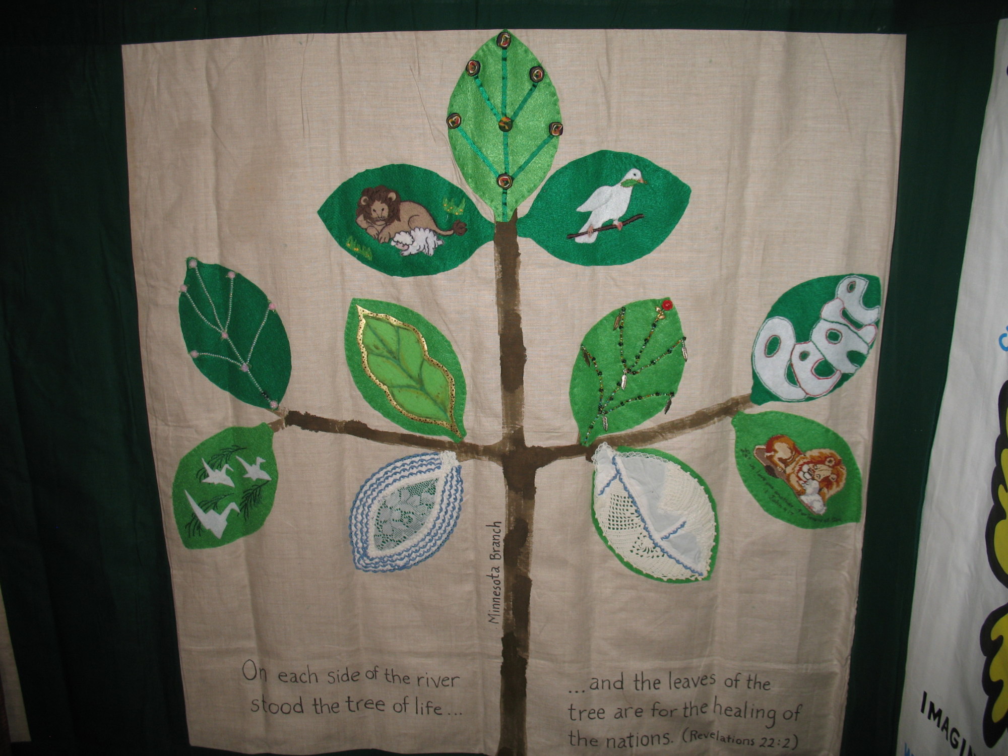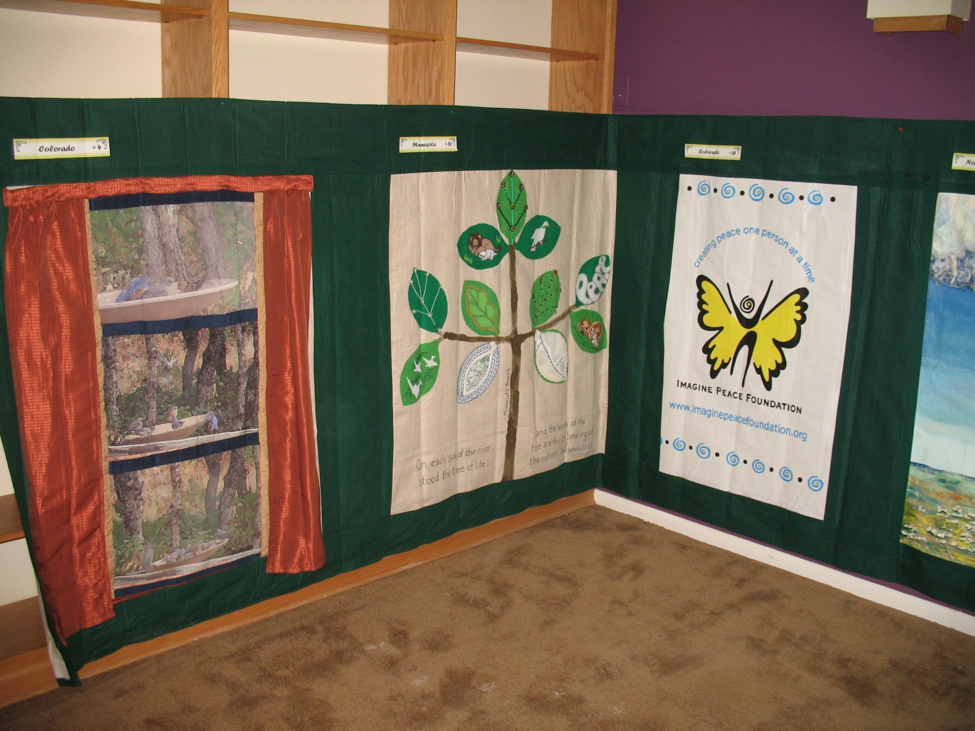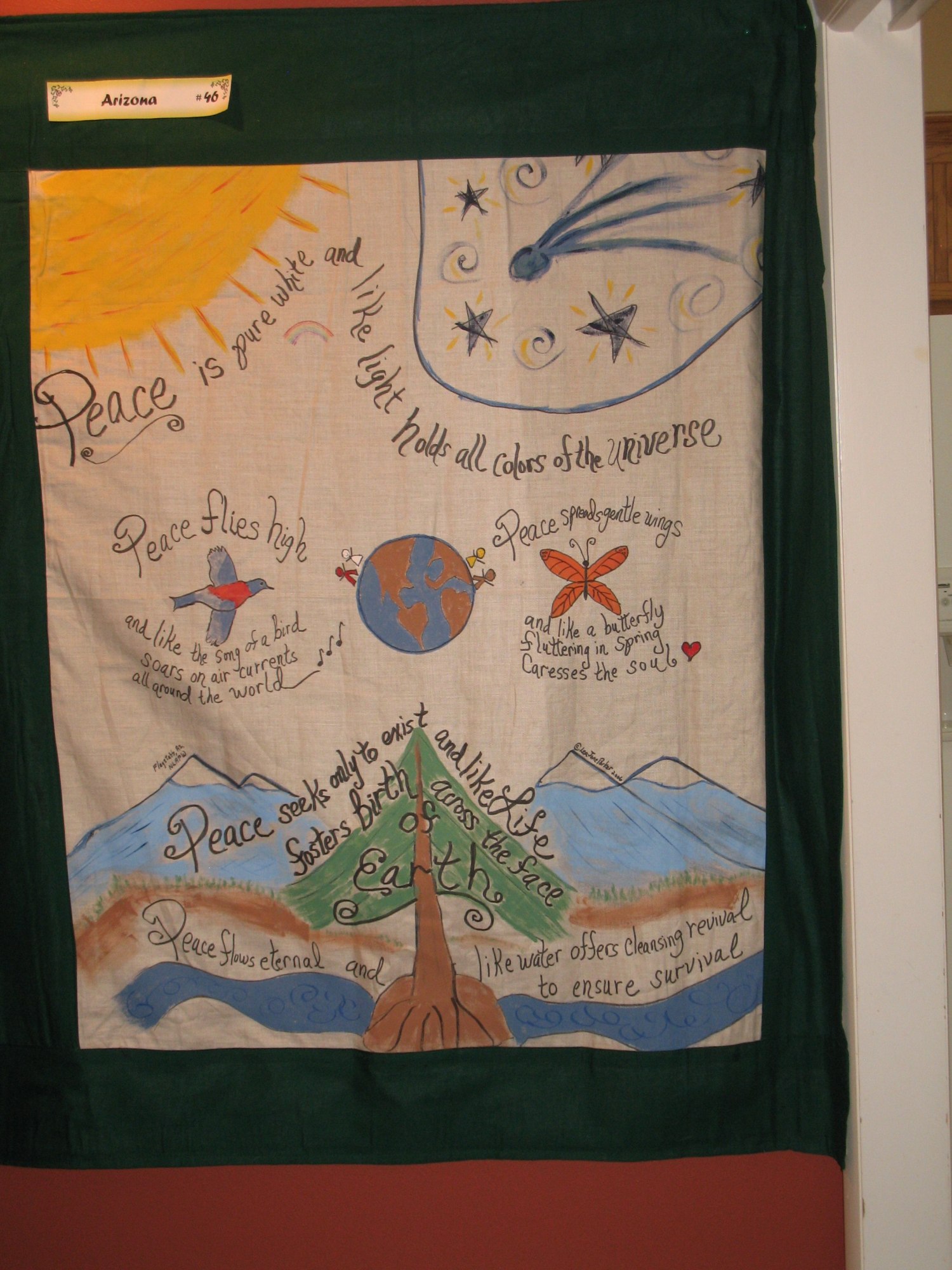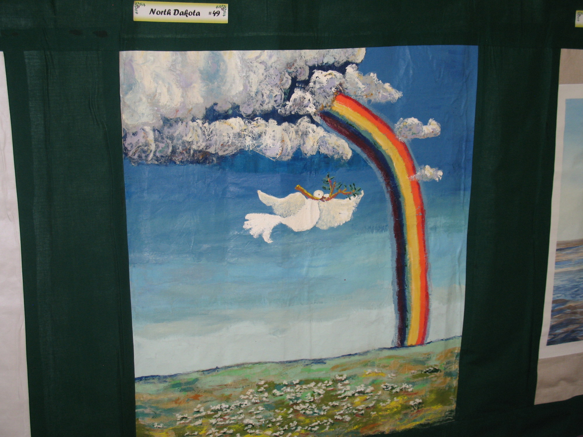 The Tapestry for Peace was inspired by a vision shown to the late Eve Mackintosh. One day on a highway she saw an angel holding two Earths: one up in the air and one close to her heart. A voice then said to Eve, “There is a place in space for peace.” This gave her the idea to create a tapestry depicting peace around the world. The quilt was created by Pen Women branches around the country, and other peace groups, schools, and individuals around the world. Eve saw the first panels finished before she died in 2005. Since then the entire quilt has been completed. A documentary DVD has been made, and the tapestry was temporarily put on display.