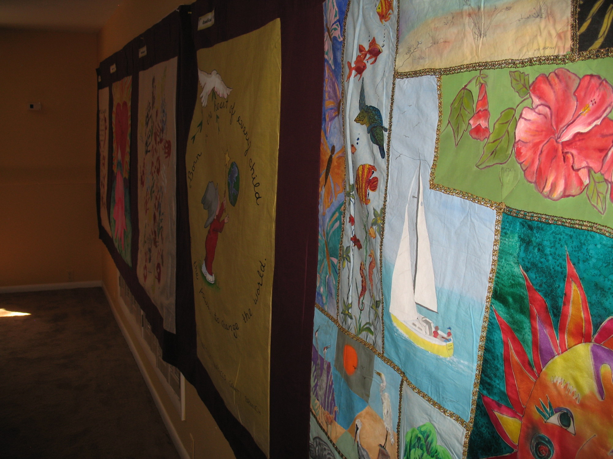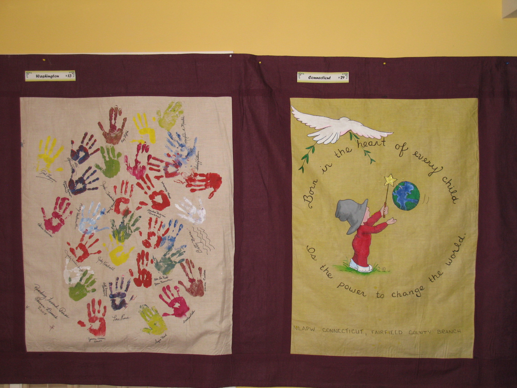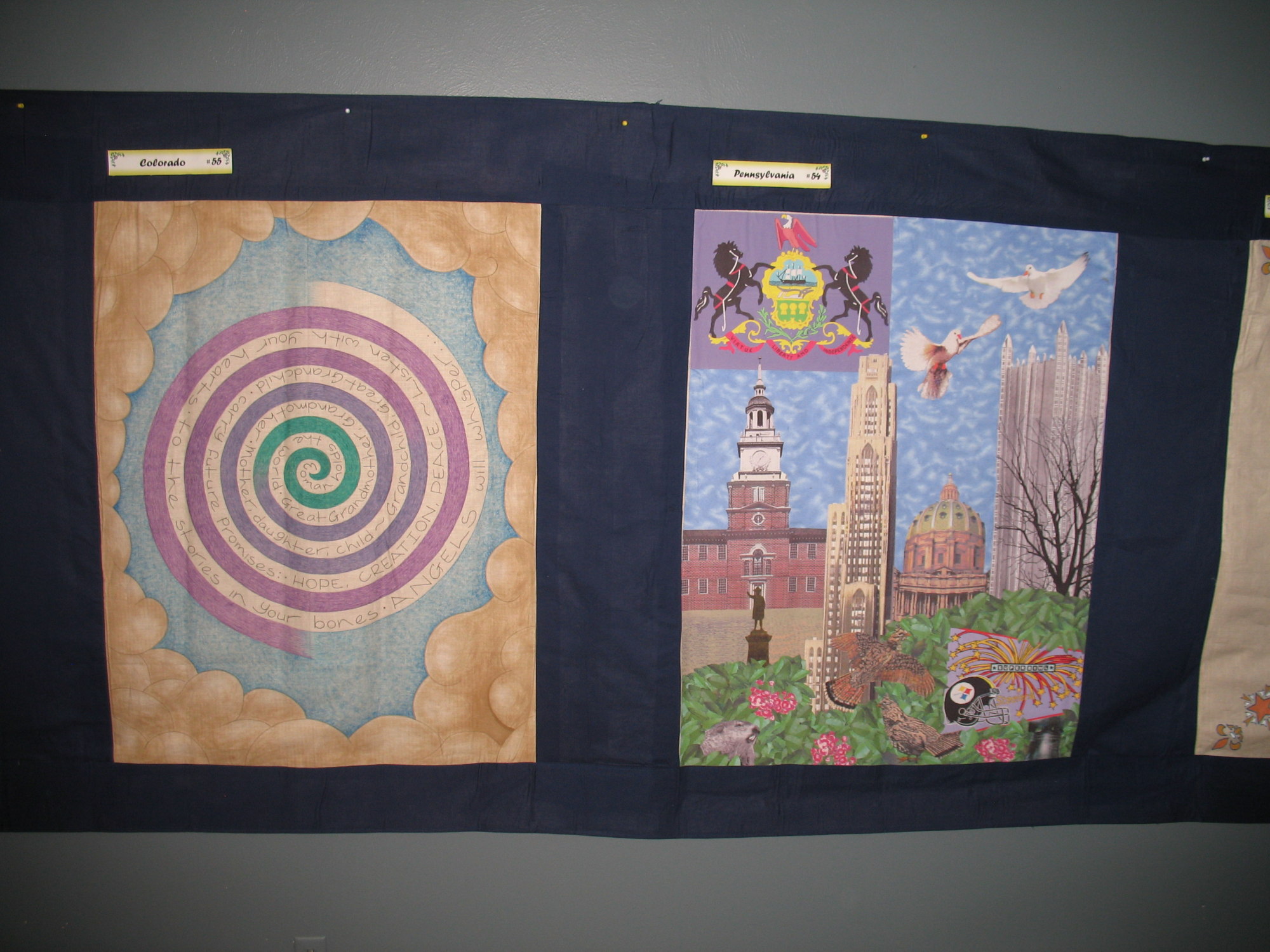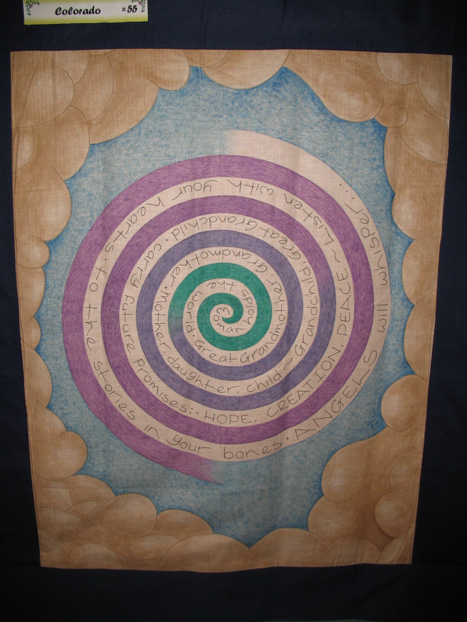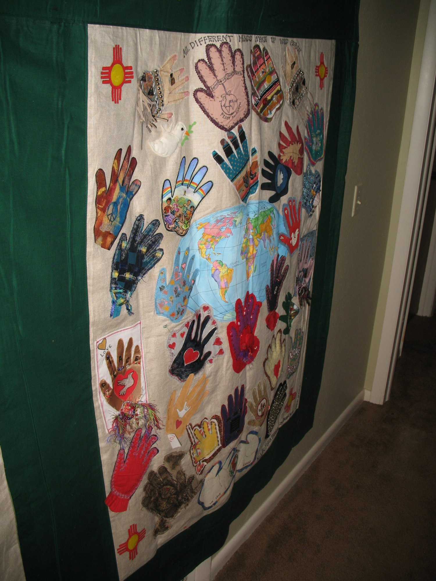 The Tapestry for Peace was inspired by a vision shown to the late Eve Mackintosh. One day on a highway she saw an angel holding two Earths: one up in the air and one close to her heart. A voice then said to Eve, “There is a place in space for peace.” This gave her the idea to create a tapestry depicting peace around the world. The quilt was created by Pen Women branches around the country, and other peace groups, schools, and individuals around the world. Eve saw the first panels finished before she died in 2005. Since then the entire quilt has been completed. A documentary DVD has been made, and the tapestry was temporarily put on display.