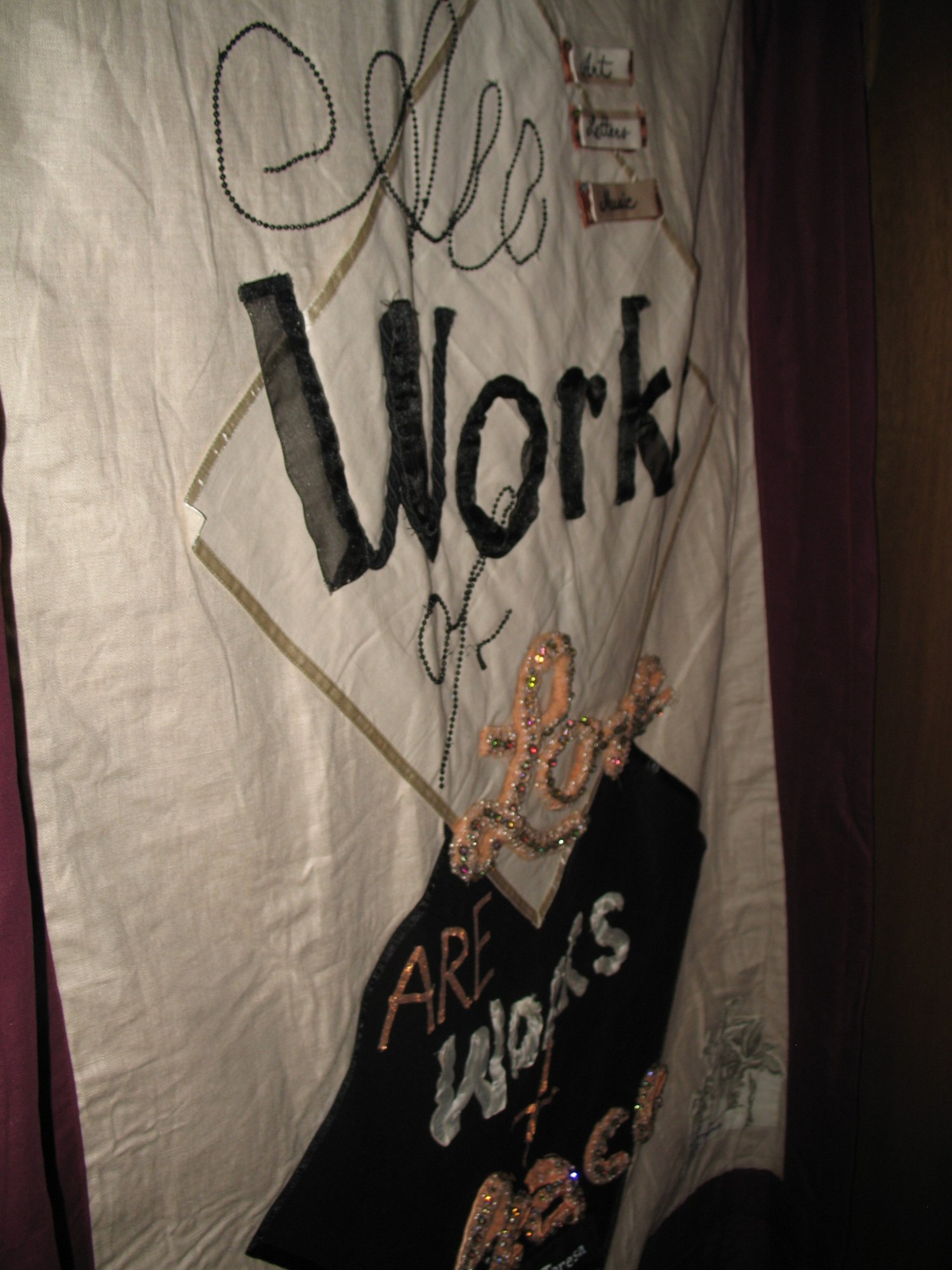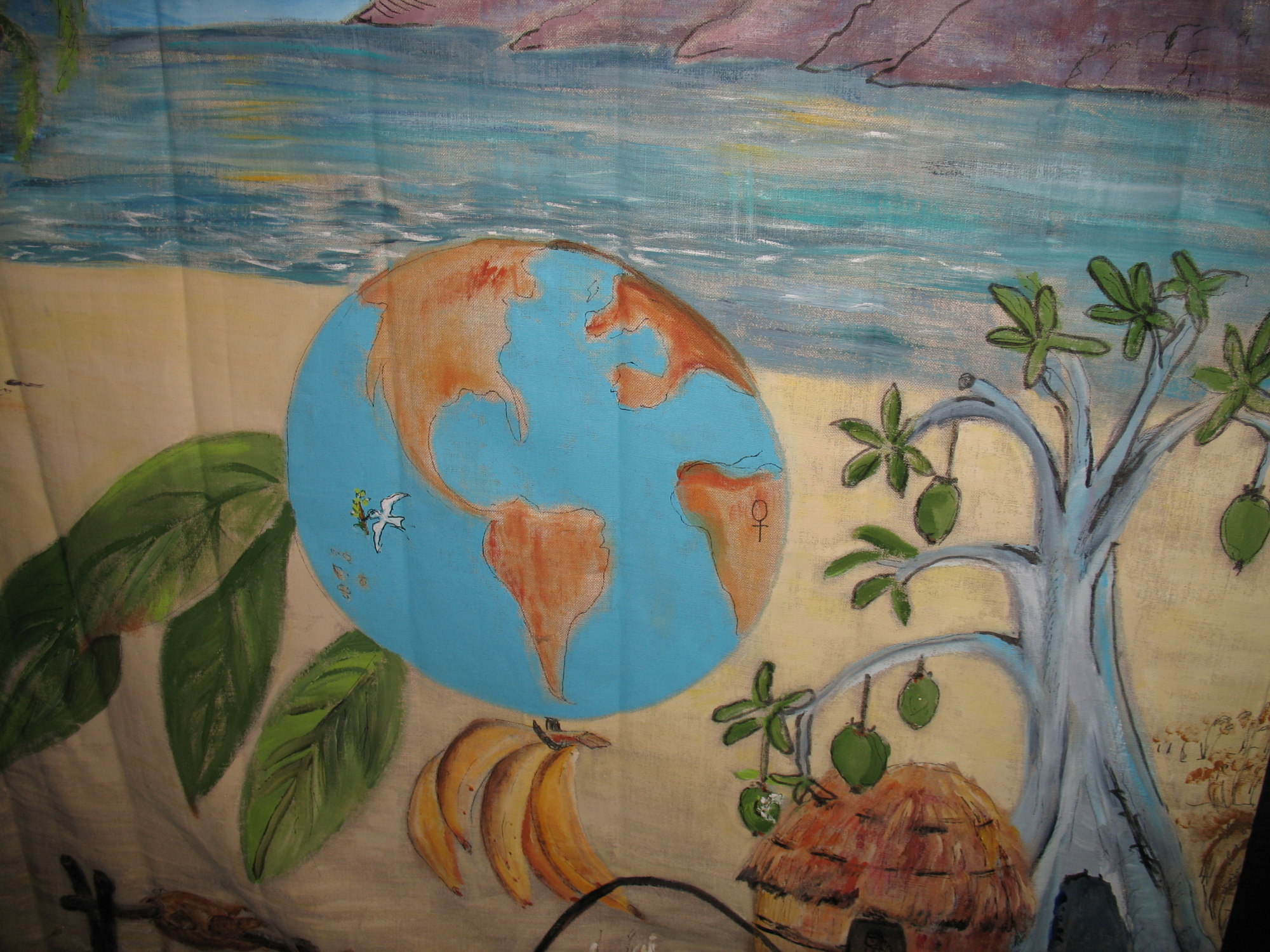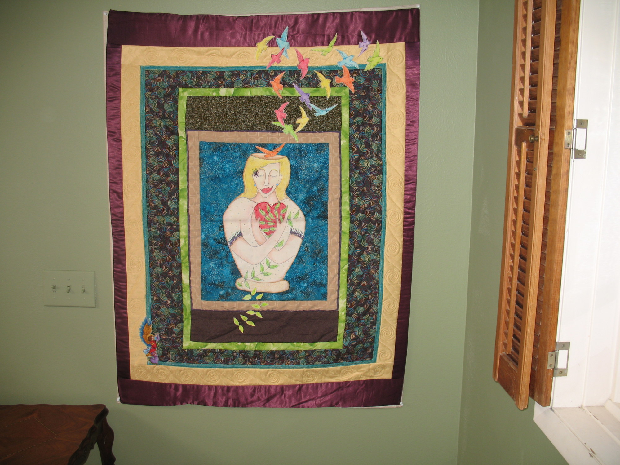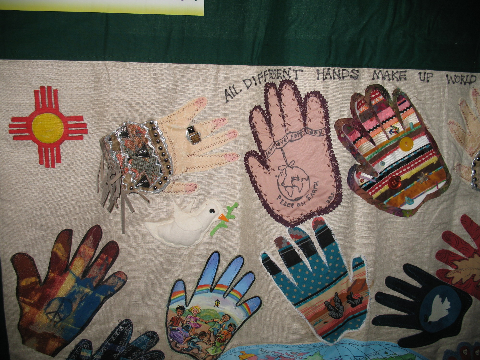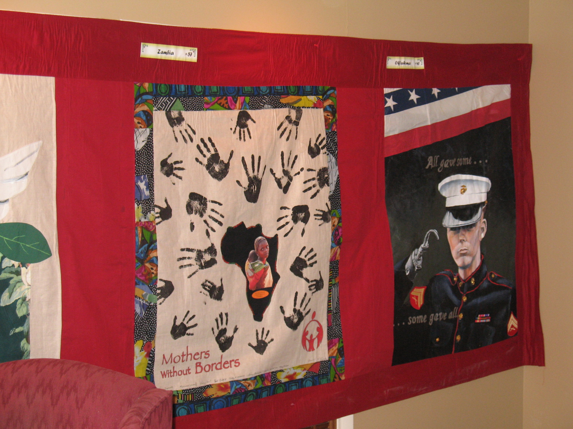 The Tapestry for Peace was inspired by a vision shown to the late Eve Mackintosh. One day on a highway she saw an angel holding two Earths: one up in the air and one close to her heart. A voice then said to Eve, “There is a place in space for peace.” This gave her the idea to create a tapestry depicting peace around the world. The quilt was created by Pen Women branches around the country, and other peace groups, schools, and individuals around the world. Eve saw the first panels finished before she died in 2005. Since then the entire quilt has been completed. A documentary DVD has been made, and the tapestry was temporarily put on display.